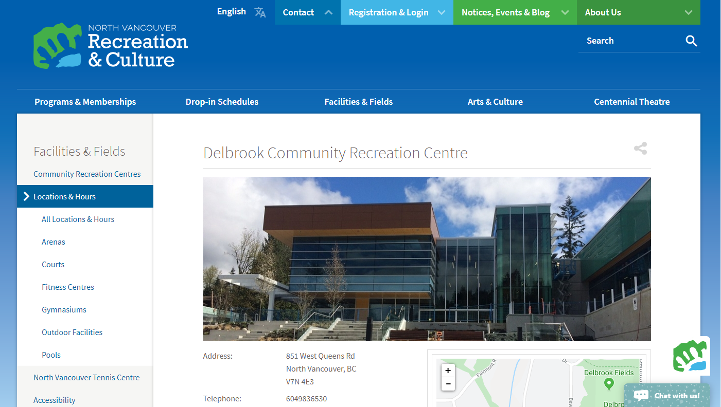 어느 지역에나 문화센터는 쉽게 찾을 수 있어요. 저는 제가 사는 동네인 노스밴쿠버 델브룩에 있는 커뮤니티 센터 수업을 알아볼게요. 웹사이트가 각각 있긴 하지만 구성이나 금액은 거의 같을 거예요. 다른 지역 커뮤니티 센터를 검색하고 싶으시다면 Google Map에서 Community Center near me 라고 검색하면 근처에 있는 문화센터가 안내될 거예요.