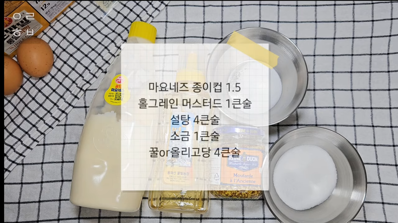 재료는 마요네즈, 홀그레인버스터드, 설탕, 소금, 꿀 입니다!